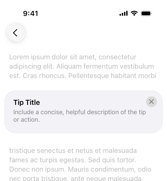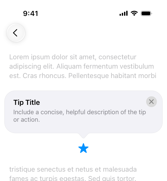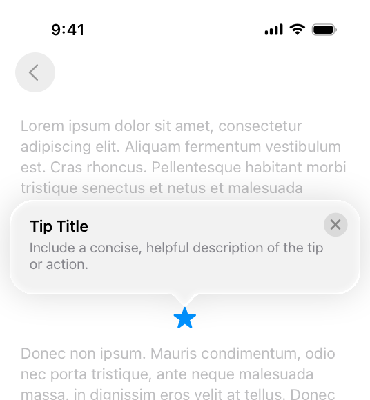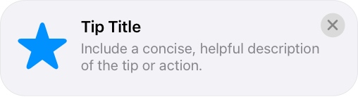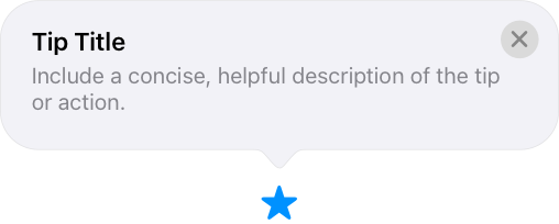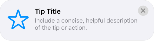 A tip is a small, transient view that briefly describes how to use a feature in your app. Tips are a great way to teach people about new or less obvious features in your app, or help them discover faster ways to accomplish a task. For developer guidance, see TipKit.